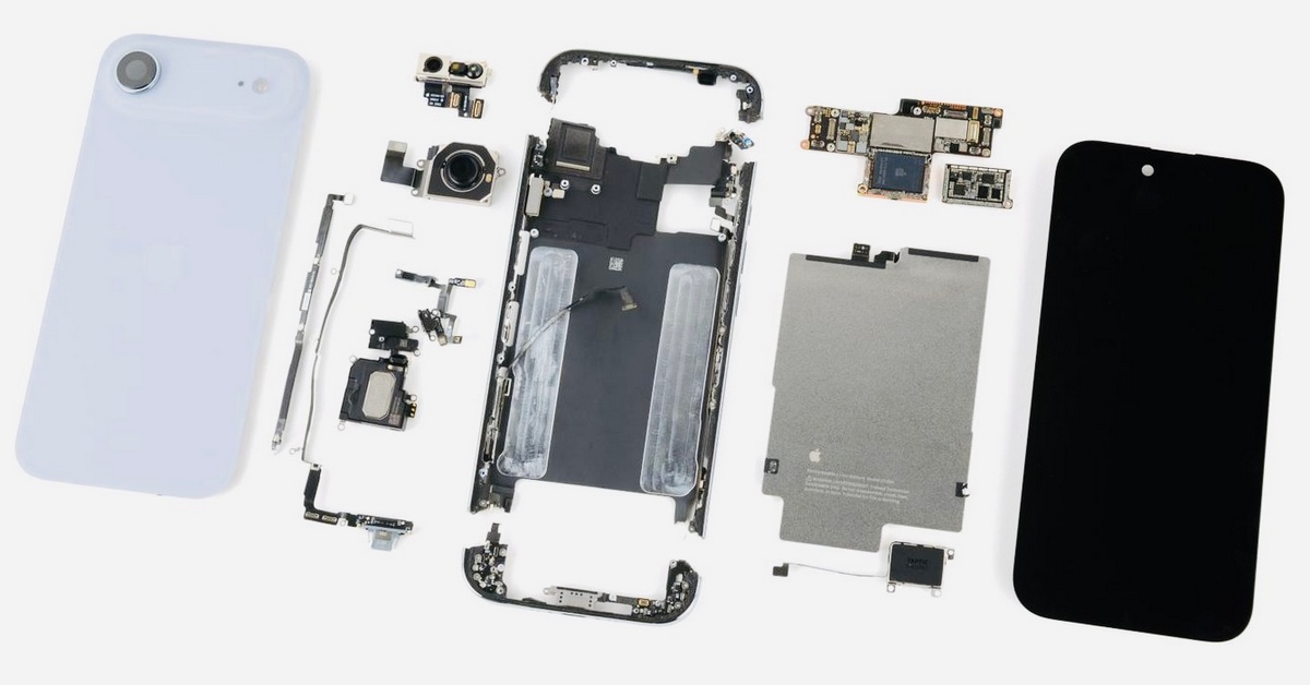 По сравнению с линейкой Plus тонкий смартфон имеет несколько дополнительных функций: он лишился нижнего динамика и одной задней камеры. На материнской плате расположены модем C1X, новый чип Wi-Fi N1 и процессор A19 Pro. Компактная система эффективно использует ограниченное пространство. Снижение сложности также способствует более быстрой разборке: чем меньше функций, тем меньше деталей и точек отказа.