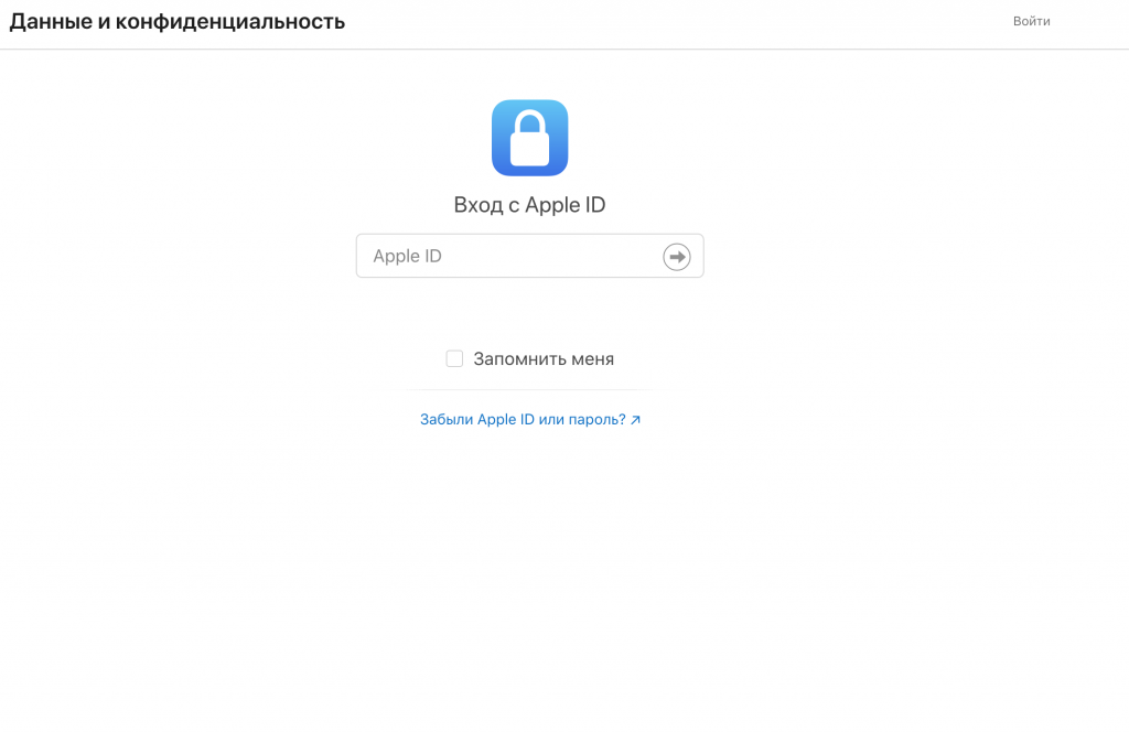 - Для начала переходим на страничку «Данные и конфидинцальность» (https://privacy.apple.com/) на официальном сайте компании, где входим в свою учетную запись: