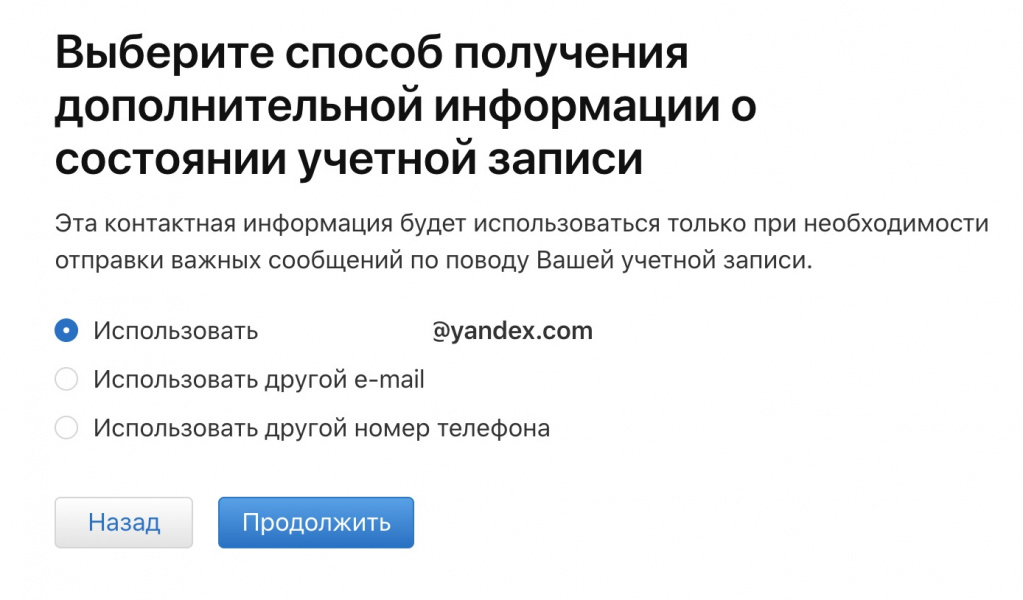 - Выберите способ получения сведений о состоянии учетной записи, здесь выбирайте или e-mail, или номер телефона