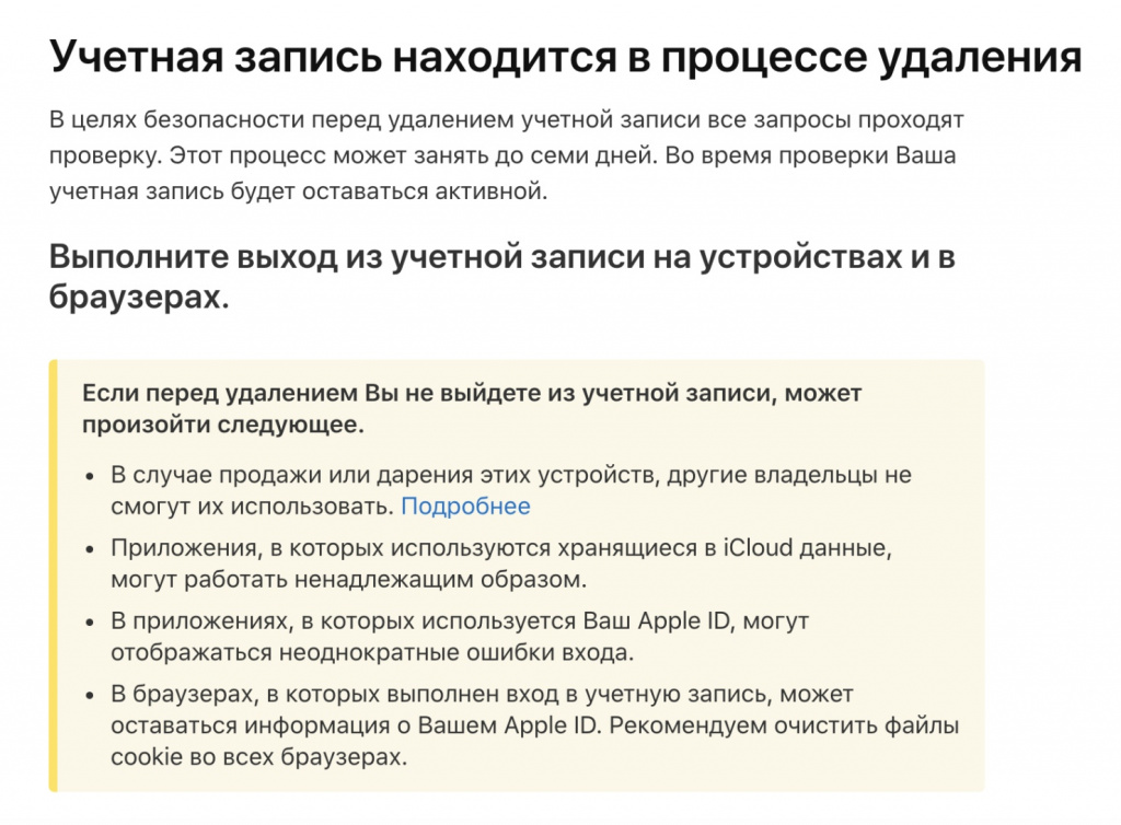 - Далее ознакомьтесь с предупреждением от Apple, в котором сообщается, что удаление учетной записи безвозвратное, то есть вы не сможете вернуть аккаунт, а вместе с ним и все данные, которые хранятся и хранились на серверах Apple. Также в данном пункте можно сделать резервную копию данных и выйти со всех устройств.